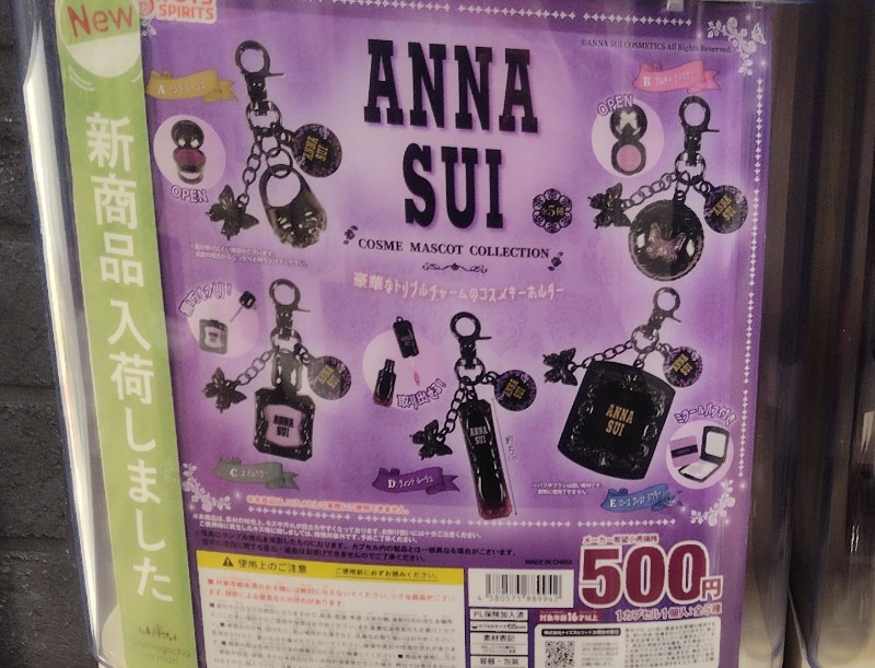 ANNA SUI コスメマスコットコレクションの価格は各500円(税込)で、全国のガチャガチャやガチャポン、ガチャなどで手に入れることができます。