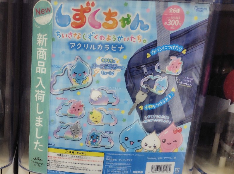しずくちゃん アクリルカラビナの価格は各300円(税込)で、全国のガチャガチャやガチャポン、ガチャなどで手に入れることができます。