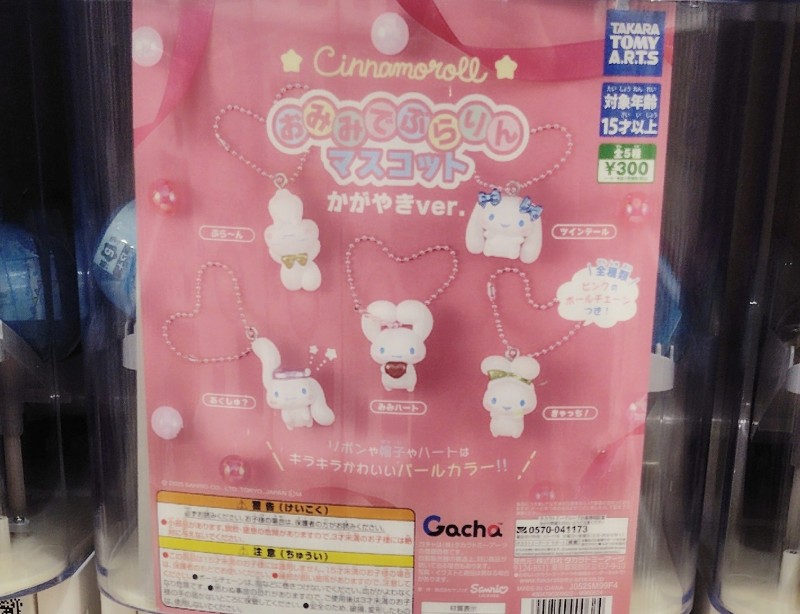 シナモロール おみみでぶらりんマスコット かがやきver.の価格は各300円(税込)で、全国のガチャガチャやガチャポン、ガチャなどで手に入れることができます。