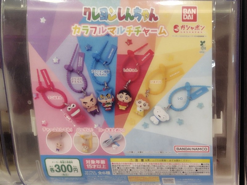 クレヨンしんちゃん カラフルマルチチャームの価格は各300円(税込)で、全国のガチャガチャやガチャポン、ガチャガチャ、ガチャなどで手に入れることができます。