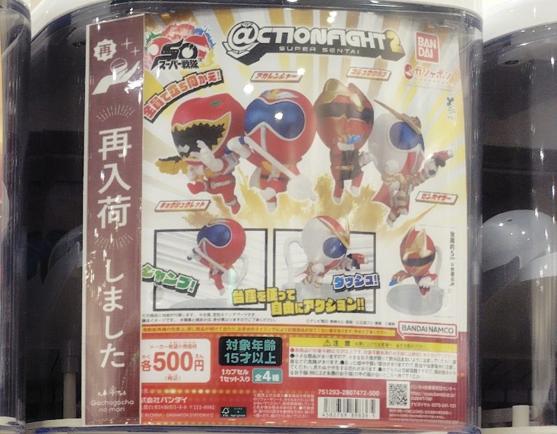 @CTION FIGHT(アクションファイト) スーパー戦隊シリーズ2の価格は各500円(税込)で、全国のガシャポンやガチャガチャなどで手に入れることができます。