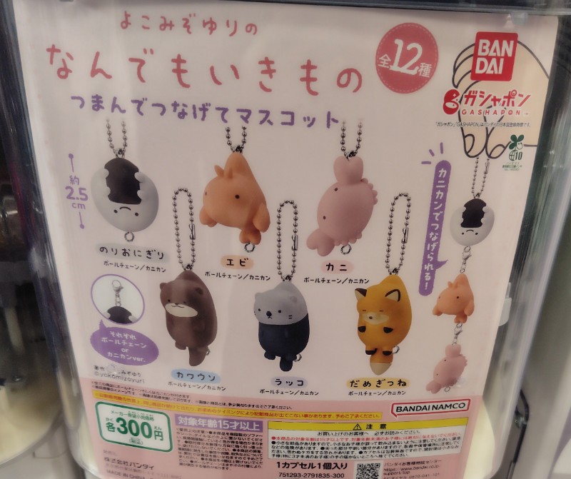 よこみぞゆりのなんでもいきもの つまんでつなげてマスコットは、全国のガシャポンやガチャガチャなどで手に入れることができるマスコットで、全12種のラインナップです。