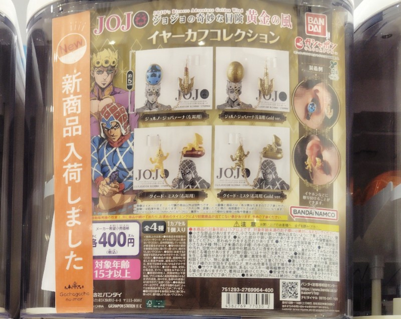 ジョジョの奇妙な冒険 イヤーカフコレクションの価格は各400円(税込)で、全国のガシャポンやガチャガチャなどで手に入れることができます。