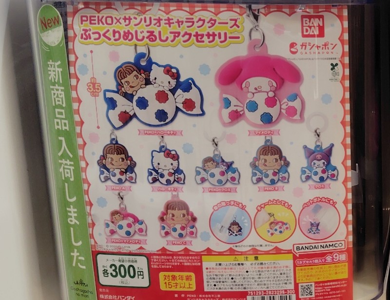 【PEKO×サンリオキャラクターズ ぷっくりめじるしアクセサリー】は、ペコちゃんとサンリオキャラクターズがコラボした、ガシャポンのめじるしアクセサリーです。