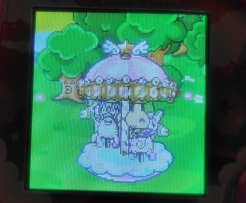 帰宅後、早速メリーゴーランドを設置してみたら、フィールドが可愛くなって、たまごっちたちが楽しそうに遊んでいました。