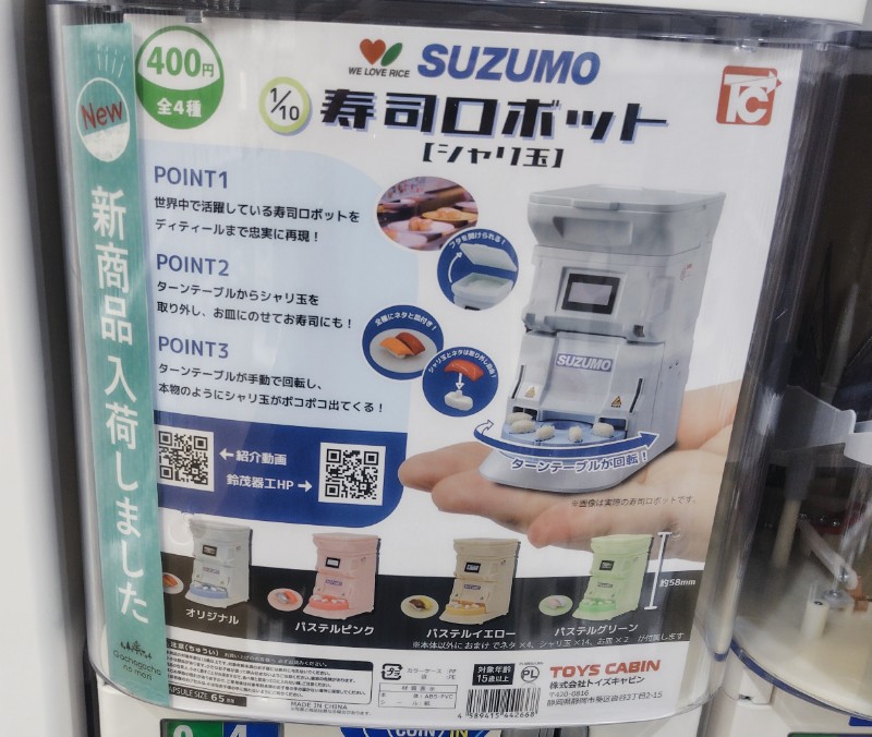 1/10 SUZUMO 寿司ロボット(シャリ玉)の価格は各400円(税込)で、全国のガチャガチャやガチャなどで手に入れることができます。